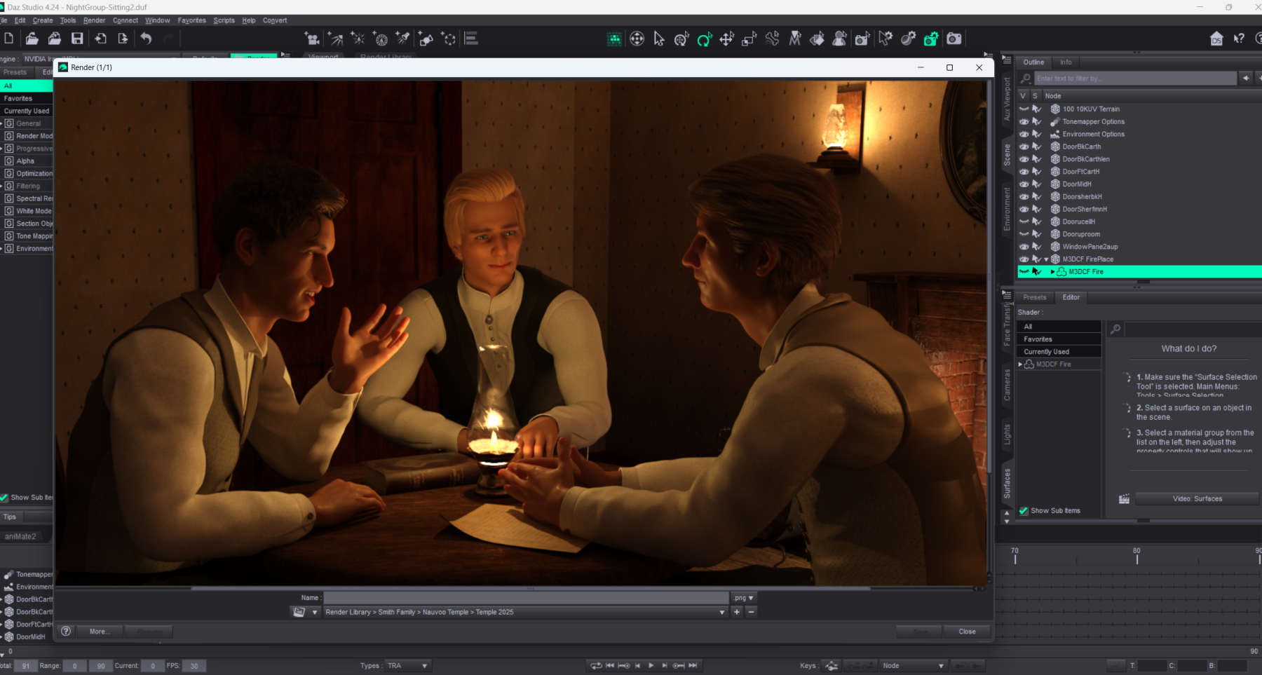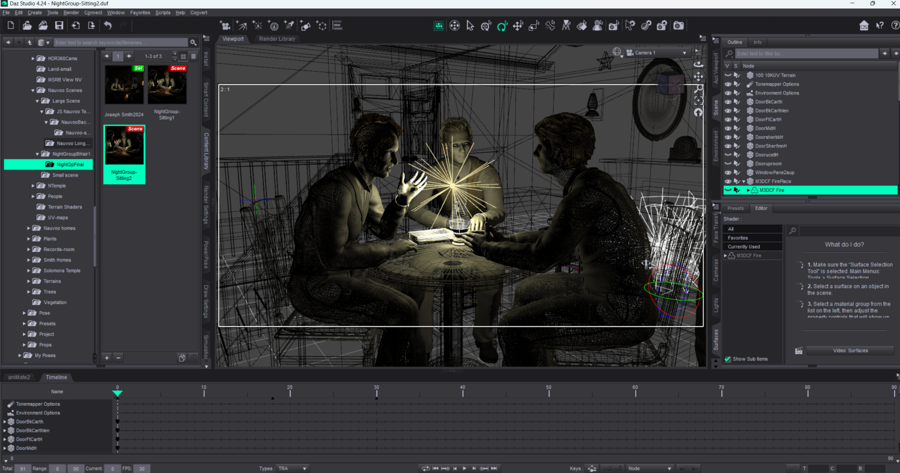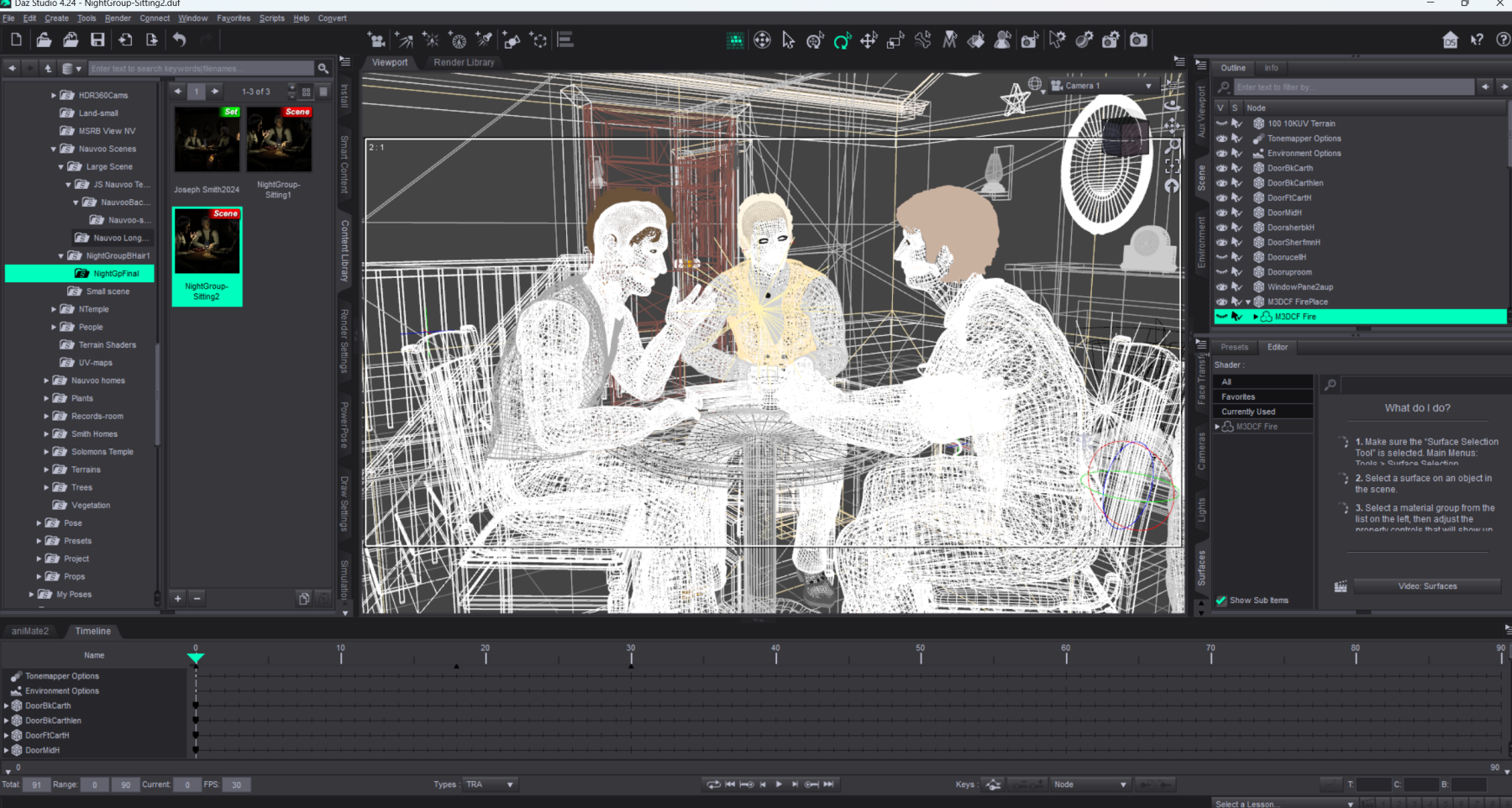 3d Scene prepared for rendering into a 2D picture. Models are posed and clothed with 3d apparel. Tables, chairs as well as the entire scene is composed of individual models with lines drawn in 3d space to give them shape. Texturing is added to those models to replicate the look and finish of those props as if they were in a real room. Lighting is added using light emitting models that replicate lights in real space.