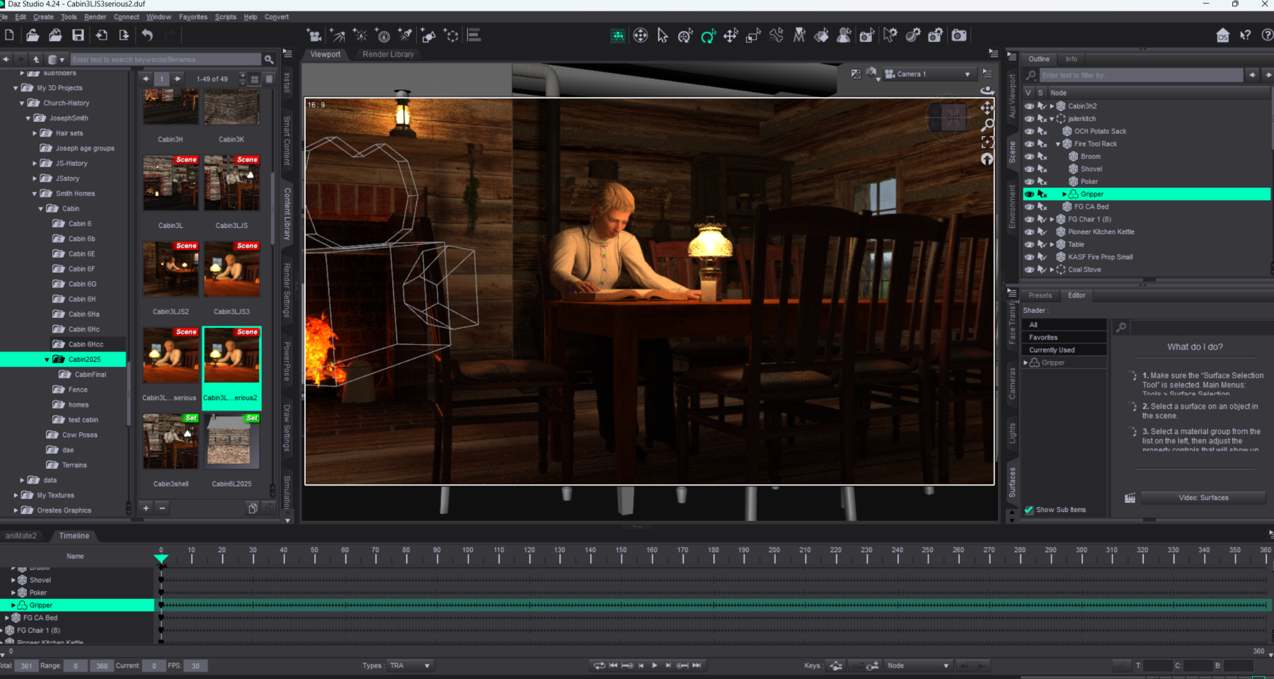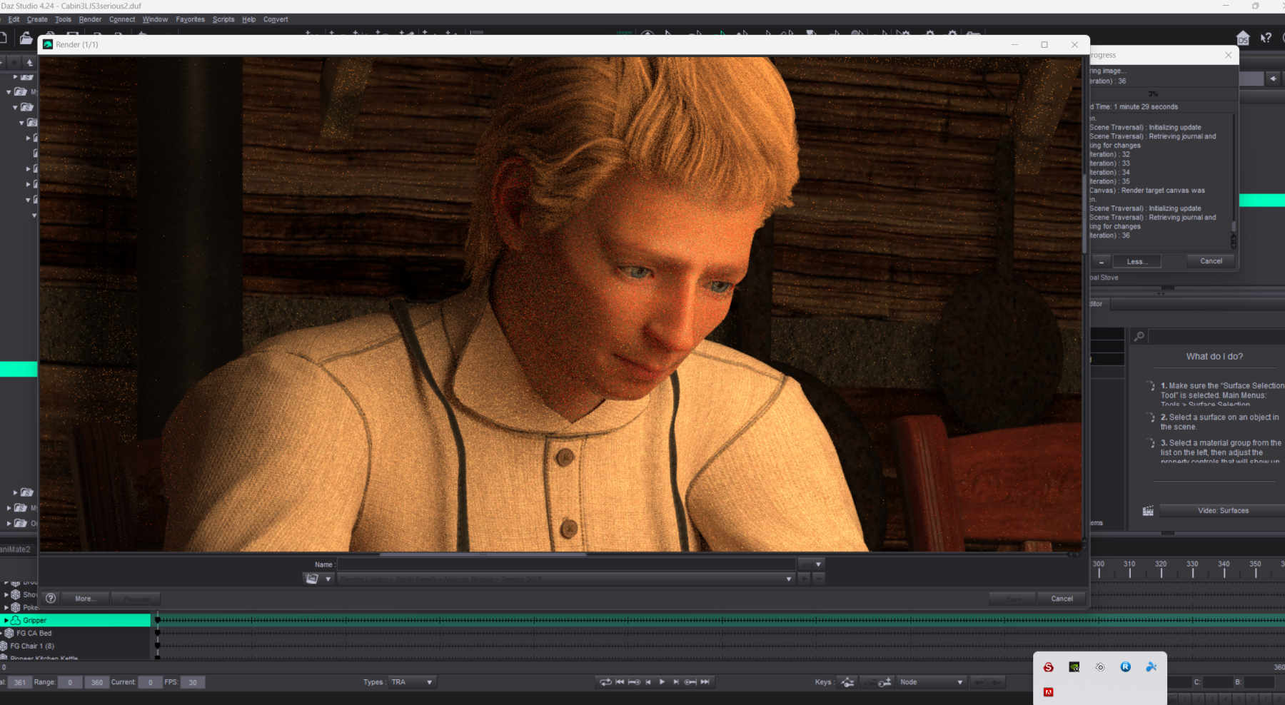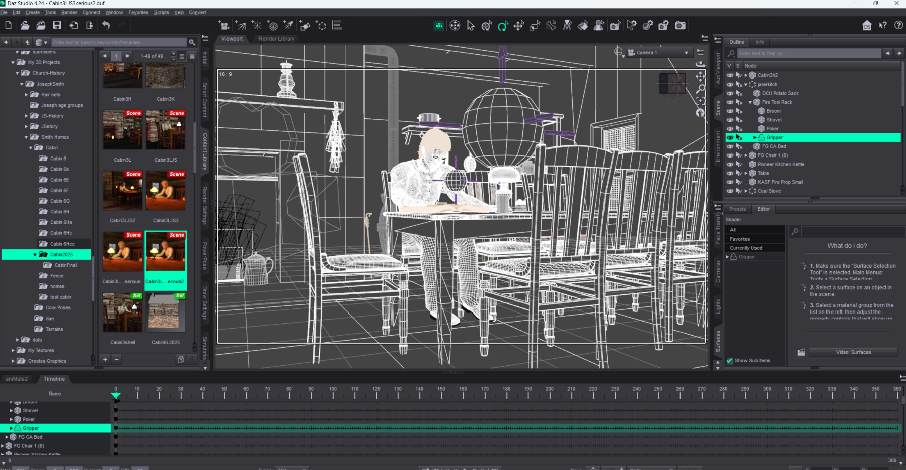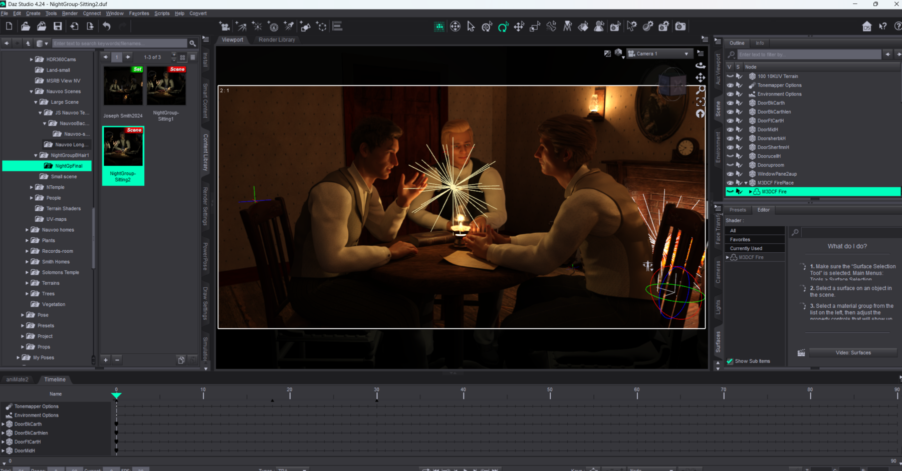 3d Scene prepared for rendering into a 2D picture. Models are posed and clothed with 3d apparel. Tables, chairs as well as the entire scene is composed of individual models with lines drawn in 3d space to give them shape. Texturing is added to those models to replicate the look and finish of those props as if they were in a real room. Lighting is added using light emitting models that replicate lights in real space.